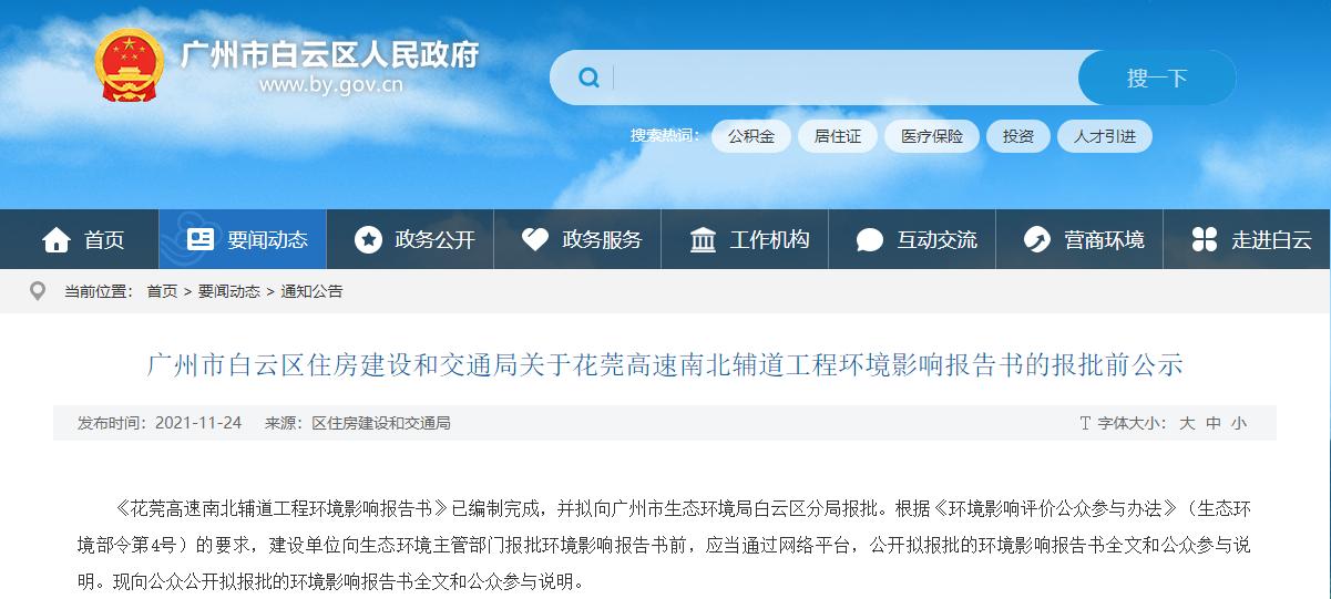 2021年11月,广州市白云区住房建设和交通局发布花莞高速南北辅道工程环境影响报告书的报批前公示,《花莞高速南北辅道工程环境影响报告书》已编制完成。据公示内容显示,本次拟建的花莞高速南北辅道工程基本沿花莞高速公路两侧布置,全长约10.4km,预计将于2023年12月完工。