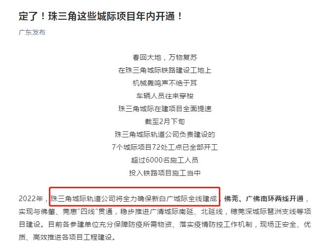 2022年2月21日,新白广城际项目14个工点全面复工,如期实现达产目标。2022年,珠三角城际轨道公司将全力确保新白广城际全线建成。
