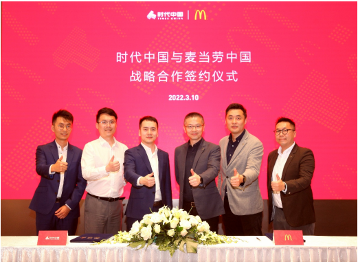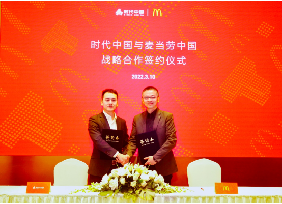 2022年3月10日,时代中国与麦当劳中国战略合作签约仪式在时代爱车小镇成功举办。双方基于过往已达成的招商合作基础,将在社区门店的开发上进一步建立合作,共同探索社区商业新模式。双方还将共同打造营销活动、共创社区服务生态,从长远战略发展角度建立深度合作关系。