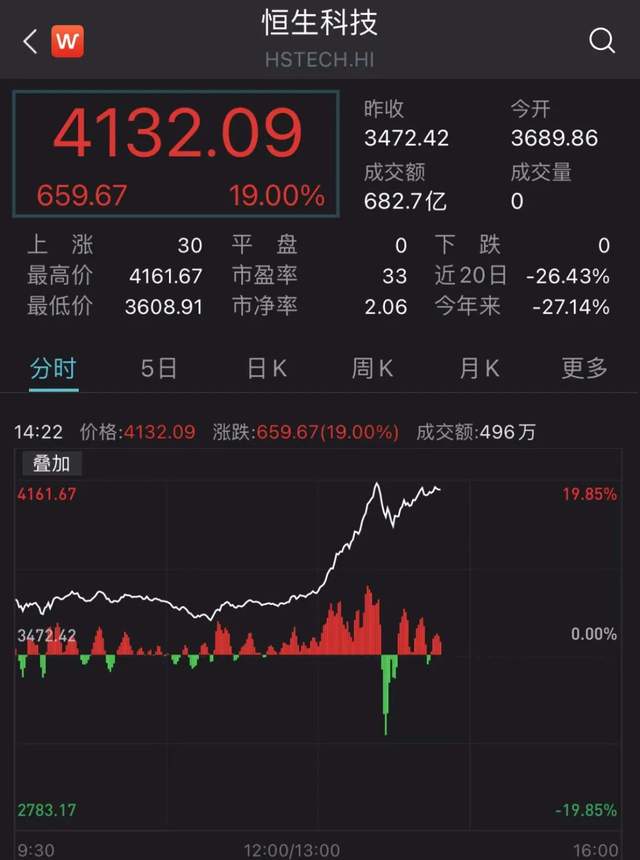 国务院金融委的消息出来之后,资本市场迅速响应,纷纷直线拉涨!恒生科技指数涨幅扩大至20%,为该指数推出以来盘中最大单日涨幅。