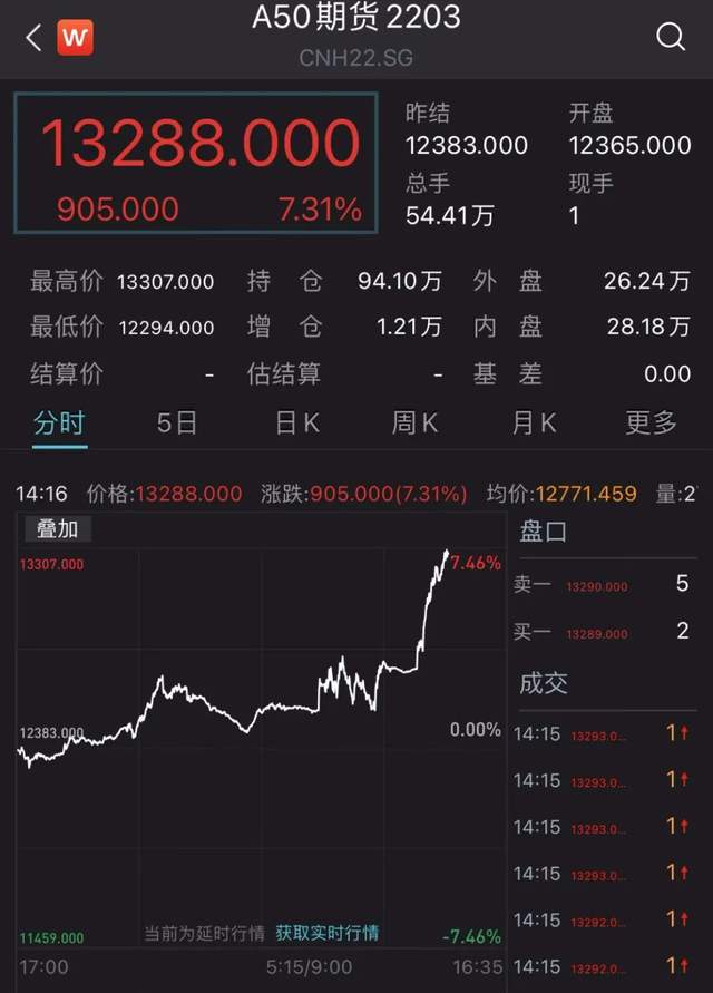 午后,富时中国A50指数期货进一步拉升,现大涨7.31%。