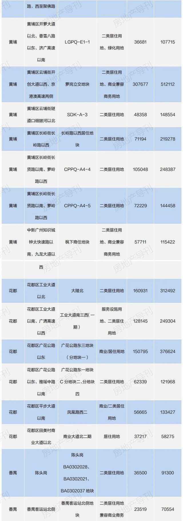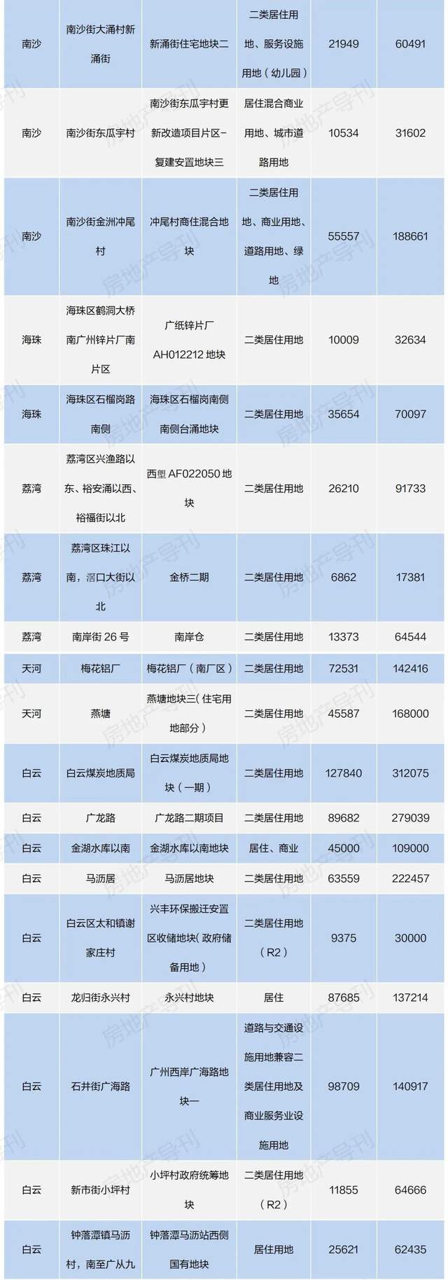 地块包含有天河梅花铝厂、燕塘地块;海珠广纸锌片厂地块、石榴岗路西侧地块;荔湾西塱AF022050地块、金桥二期地块、南岸仓地块;白云新市街小坪村地块、黄石街陈田村地块、白云煤炭地质局地块、广龙路地块;番禺客运站北侧地块、桥南街涌口村地块;南沙横沥镇横沥岛合兴路北侧地块、黄阁镇坦尾村地块、南沙街大涌村新涌街地块等。