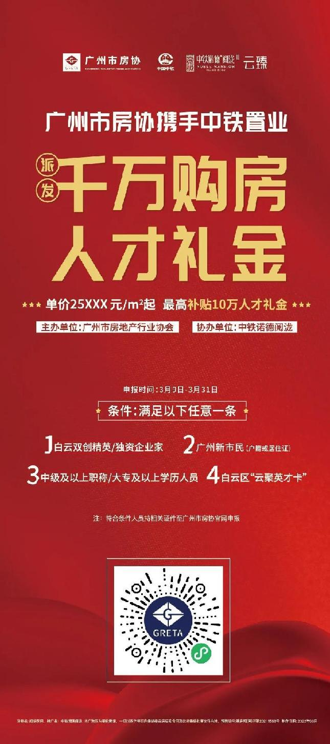 为了响应政府号召,在坚持“房住不炒”主基调前提下,倡导理性住房消费观念,活跃楼市交易,吸引更多人才选择白云、扎根白云,为实现白云区经济高质量发展提供强大的人才支撑,确保新市民购房安全、可靠,广州市房协从3月9日至3月31日,携手世界500强央企中铁置业旗下项目——“中铁诺德阅泷”派发千万购房人才礼金,助力更多人才安居白云,活动期间获取现场所有优惠折扣后,最高再减免10万人才礼金。