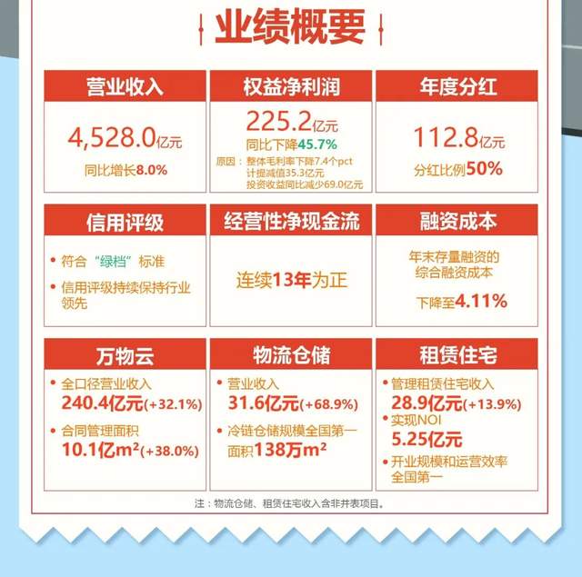经营指标方面,万科实现营业收入为4528.0亿元,同比增长8.0%;归属于上市公司股东的净利润为225.2亿元,同比下降45.75%。