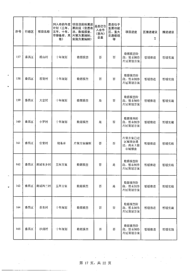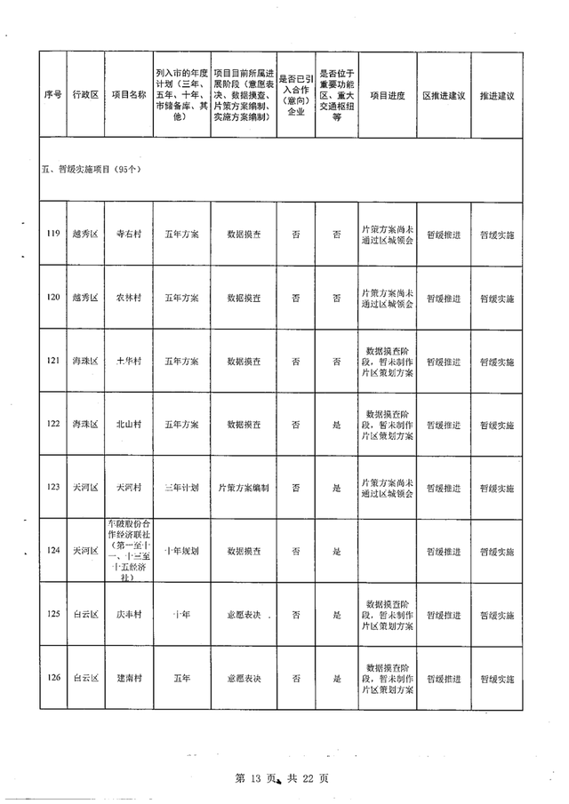 近期,广州市城市更新相关文件透露,广州各区旧改项目将分别按稳妥推进(23条)、继续前期研究(74条)、转征收储备(19条)、转微改造(2条)、暂缓推进(95)等5个类别实施。