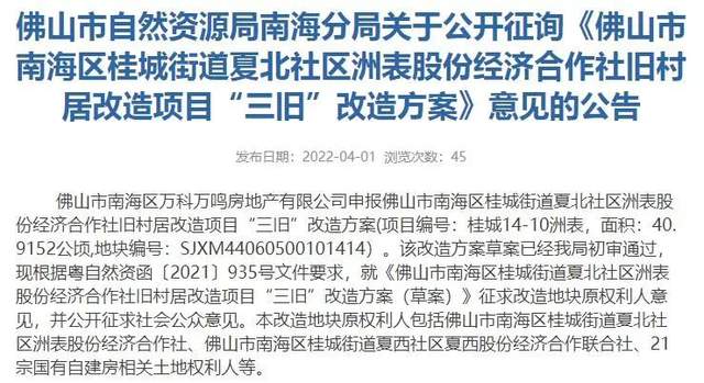 4月1日,佛山市自然资源局南海分局发布关于公开征询《佛山市南海区桂城街道夏北社区洲表股份经济合作社旧村居改造项目“三旧”改造方案》意见的公告。