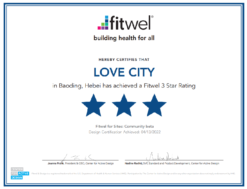 2022年4月,爱情地产旗下保定爱情城项目,正式获得Fitwel三星级认证,其为中国首个FITWEL社区认证。