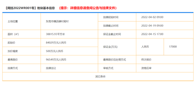 2022WR001地块位于东莞市横沥镇村尾村,总占地38815.93㎡, 容积率小于等于2.64,总建面约102474㎡,地块采用“最高限价+终次报价”方式竞拍。