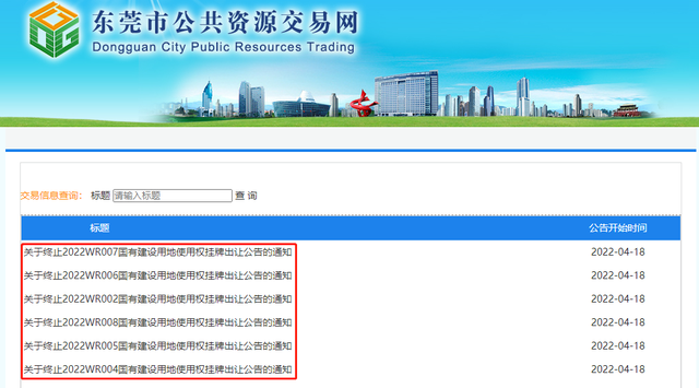4月18日,东莞市公共资源交易中心发布的信息显示,原定于4月19日-20日集中出让的东莞首批8宗宅地,其中6宗因故终止出让。