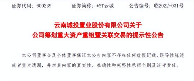 4月20日,云南城投置业股份有限公司发布关于公司筹划重大资产重组暨关联交易的提示性公告。