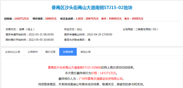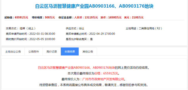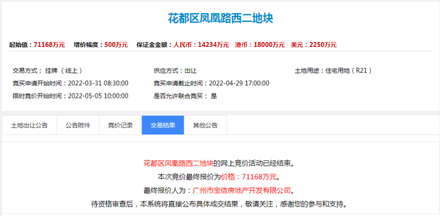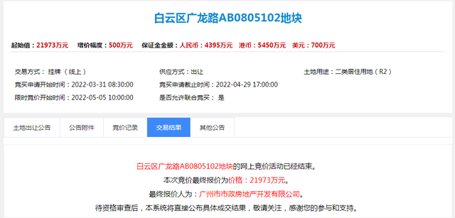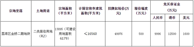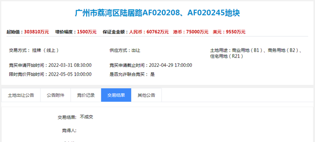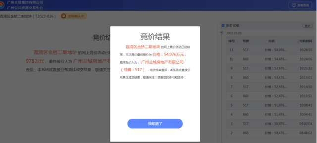 其中,荔湾区金桥二期地块,经过11轮竞价,2家房企竞拍,最终被兰园控股以总价54976万元拿下,折合楼面价33198元/㎡!另外同在荔湾区的陆居路AF020208、AF020245地块,因无人竞拍,遭流拍!