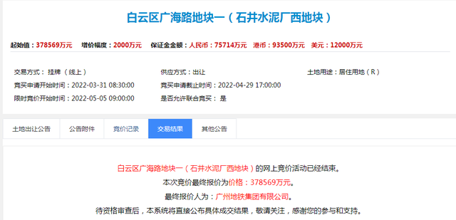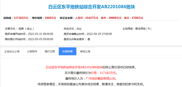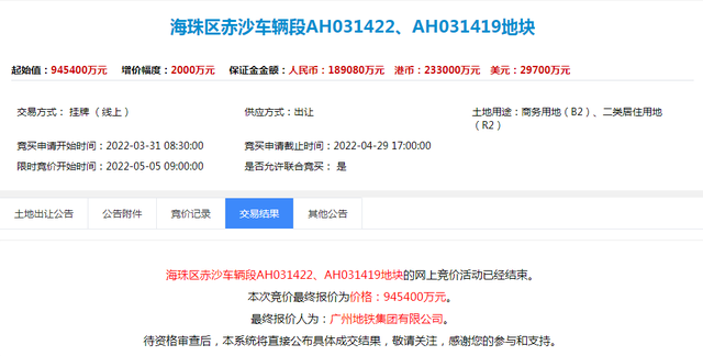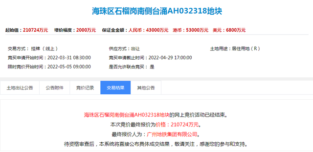 此外,广州地铁集团以底价共165.19亿元斩获4宗宅地。宗地分别为:海珠区赤沙车辆段AH031422、AH031419地块,成交价945400万元,折合楼面价22538元/㎡;石榴岗南侧台涌AH032318地块,成交价210724万元,折合楼面价37570元/㎡;白云区广海路地块一(石井水泥厂西地块),成交价378569万元,折合楼面价20829元/㎡;东平地铁站综合开发AB2201086地块,成交价117182万元,成交楼面价25011元/㎡。