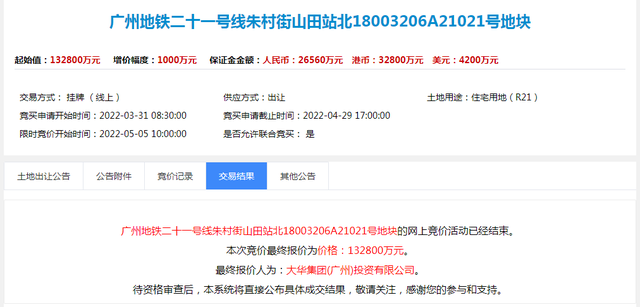 此外,广州地铁二十一号线朱村街山田站北18003206A21021号地块被大华集团以底价132800万元竞得,折合楼面价8963元/㎡!