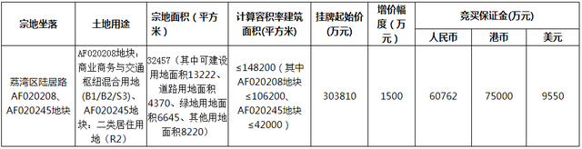 地块距芳村站500米,地块铁1号线、11号线、22号线、28号线沿线;地块邻近珠江,位于白鹅潭商务区核心区内,地理优势较好。地块起价303810万元,楼面起价20500元/㎡,上限价349381万元,上限楼面价23575元/㎡。