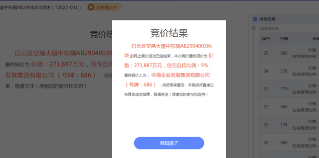 其中,最抢手的为白云区空港大道中东侧AB2904003地块,经过25轮竞价,12家房企疯狂竞拍,最终被中海地产以封顶价271887万元+住宅自持比例9%拿下,折合楼面价4.15万元/㎡,溢价率15%(扣除自持比例)。