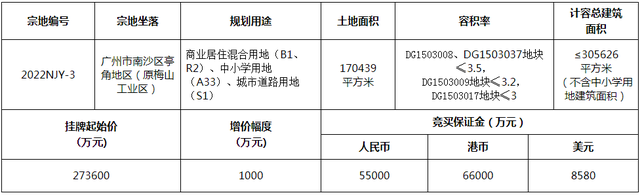 地块要求竞得人须按规划要求建设DG1503013地块(中小学用地),建成后无偿移交给广州市南沙区政府指定部门;据了解到,该地块将建成54班九年一贯制学校、12班幼儿园、1个托儿所,以及生鲜超市、邮政所等基础公共设施,其生活便捷也将辐射给相邻的2022NJY-2地块。