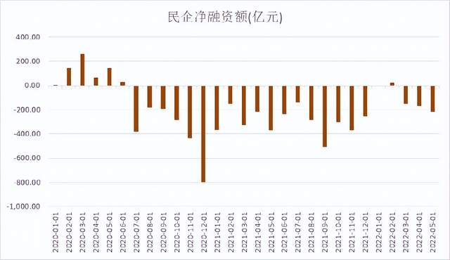 根据WIND数据,我们可以看到,自2020年起到2022年4月一共有29个自然月,其中民营企业有22个月在国内债券市场净融资额为负,这意味着大部分民企基本退出债券融资市场。