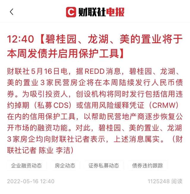 5月16日,据REDD消息,碧桂园、龙湖、美的置业3家民营房企被监管机构选定为示范房企,将在本周陆续发行人民币债券。为吸引投资人,创设机构将同时发行包括信用违约掉期(私募CDS)或信用风险缓释凭证(CRMW)在内的信用保护工具,以帮助民营地产商逐步恢复公开市场的融资功能。