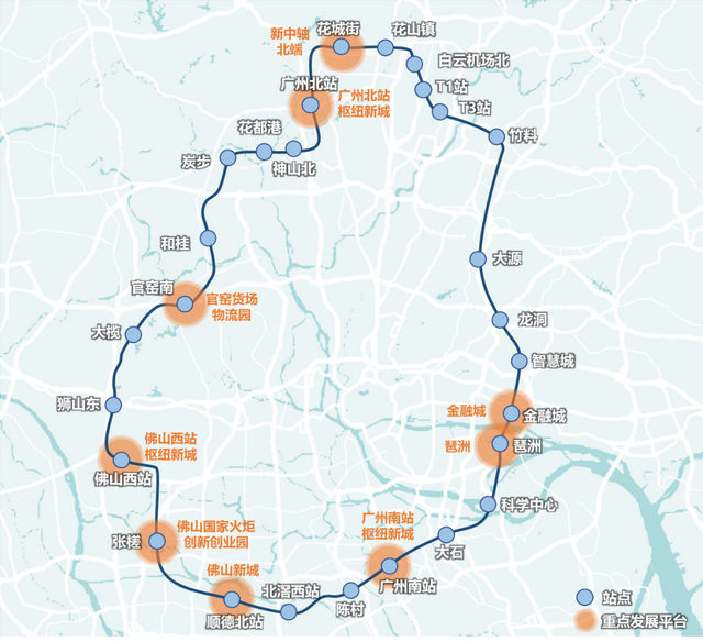 环线北环(花都-白云机场)已经建成通车,南环(佛山西站-广州南站)确定将在年内通车,东环(广州南站-白云机场)等多个施工节点都在顺利推进,按计划将于2023年通车,而西环(花都-佛山西站)也将于今年开工。