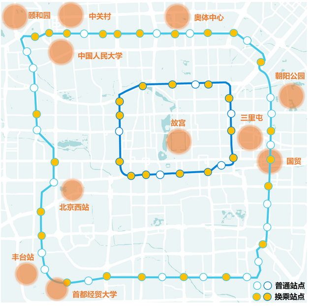 拥有两条环线的北京可以完美印证这一点。北京地铁2号线几乎沿内城城墙修建,环线内的区域自古以来就是中国的政治、文化中心。而“画圈”更大的10号线,则串联起了中关村、国贸、三里屯等世界级商业商务区,重要性无需多言。两条环线的站点换乘率到达了63%,几乎覆盖市内的全部轨道交通线路。