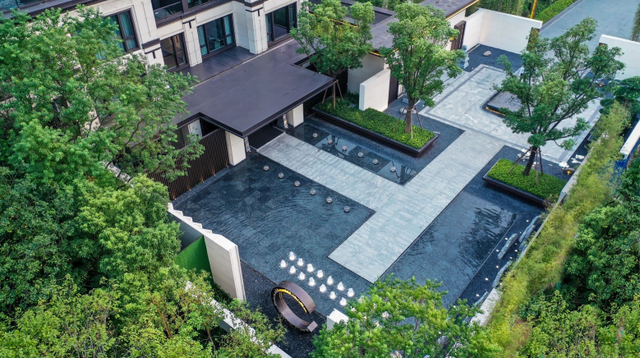 在空间布局上,中冶·逸璟公馆也充分体现了岭南的地域文化特色。以岭南四大园林之一的“梁园”与广州传统“西关大屋”为参照,中冶·逸璟公馆的房屋布局以中轴为对称,意境层层递进,并搭配现代手法设计不规则的汀步,增加生活趣味。