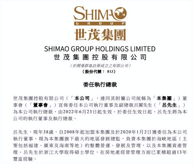 资料显示,吕翼,现年38岁,自2008年起加盟世茂集团及于2020年1月2日获委任为公司执行董事,现为世茂集团旗下最大的地区发展总监,负责集团于海峡地区(主要包括褔建、广东及海南等地)的整体营运、发展及管理,以及集团资产管理。吕翼于浙江大学取得硕士学位,在房地产经营管理方面已累积超过13年丰富经验。