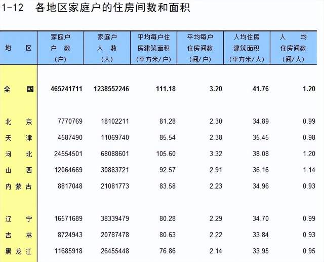 国家统计局于近期公布的《中国人口普查年鉴-2020》显示,我国家庭户人均居住面积达到41.76平方米,平均每户住房间数为3.2,平均每户居住面积达到111.18平方米。