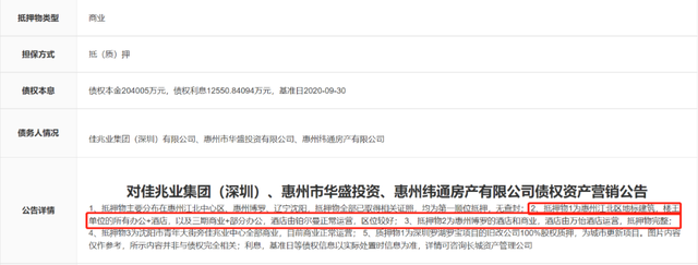 其中,惠州地标佳兆业中心二期的所有办公用房和酒店,办公用房建面约73849.13㎡、商业建面约6121.24㎡、酒店建面约26724.39㎡均被抵押;