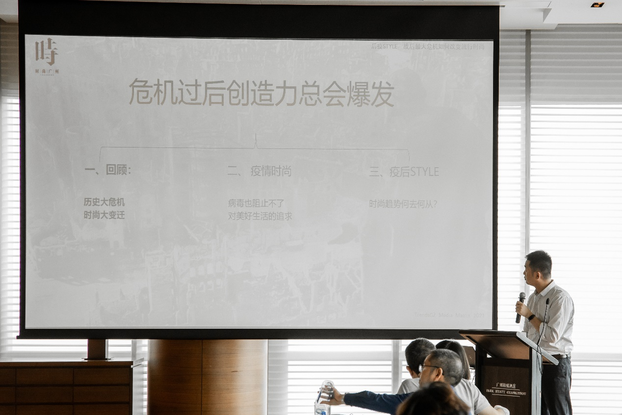 时尚生活主编唐海旻先生分享了《后疫STYLE: 二战以来最大危机如何改变时尚流行》,他通过历史上数次大规模战争和疫情后产生的新的时尚潮流的观察,分析此次新冠疫情期间居民形成的消费、生活习惯,预测疫情后的时尚流行趋势。