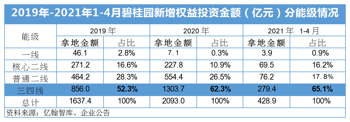 根据今年碧桂园企业年报显示,在2020年年底可售货值中,73%的土储聚焦五大都市圈、98%位于常住人口50万人以上的区域、93%位于人口流入区域,大多数货量的分布符合人口流动趋势。从2019-2021年碧桂园的新增权益投资金额分布来看,超过50%的投资金额均分布于三四线城市,可以说碧桂园之所以能够实现业绩腾飞,与其深耕三四线的战略是分不开的。