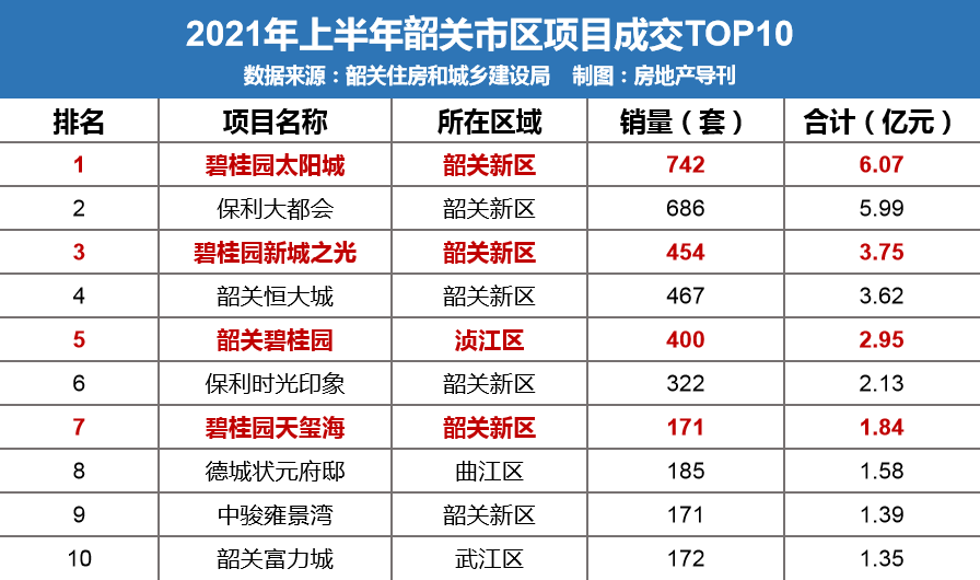 据韶关住房和城乡建设局网站统计显示,2021年上半年,碧桂园太阳城以6.07亿元、742套的成交量成为当之无愧的销榜冠军,TOP10榜内的入围项目碧桂园就占了四席!