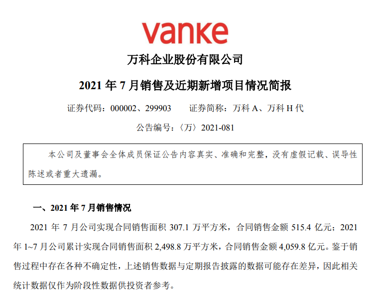 8月4日,万科A发布2021年7月销售业绩。7月份,万科实现合同销售面积307.1万平方米,合同销售金额515.4亿元,同比降12.7%。
