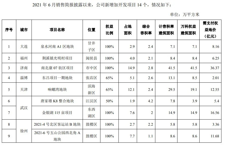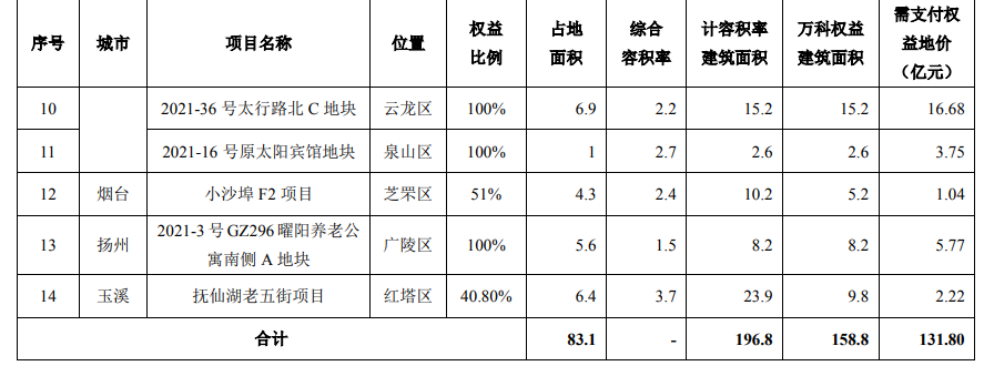 新增开发项目方面,7月万科新增加开发项目14个,项目分别位于大连、福州、济南、淄博、天津、武汉、徐州、烟台、扬州、玉溪,合计占地面积137.7万平方米,计容积率建筑面积196.8万平方米,万科权益建筑面积158.8万平方米,需支付权益地价131.8亿元。