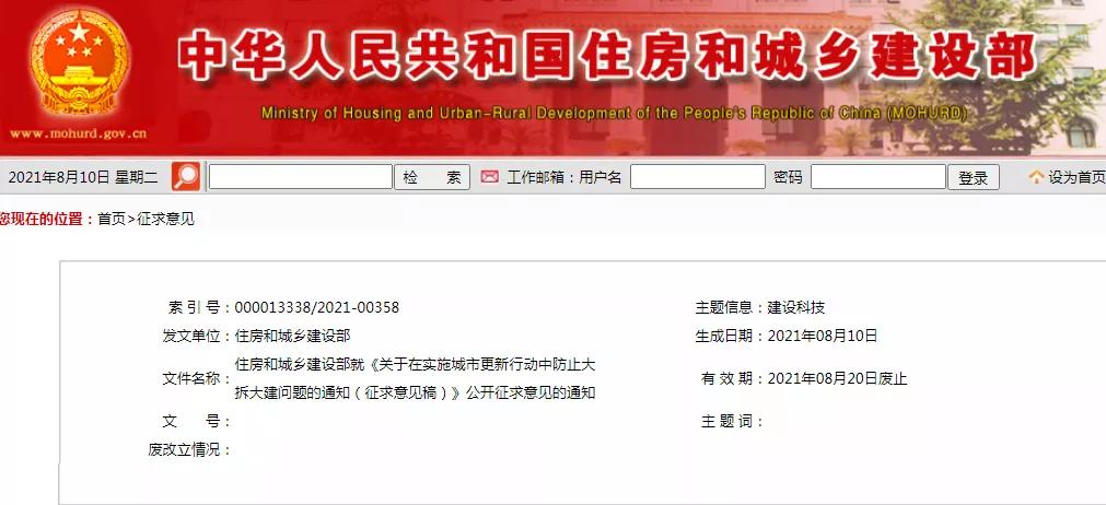 8月10日,住建部就《关于在实施城市更新行动中防止大拆大建问题的通知(征求意见稿)》公开征求意见。