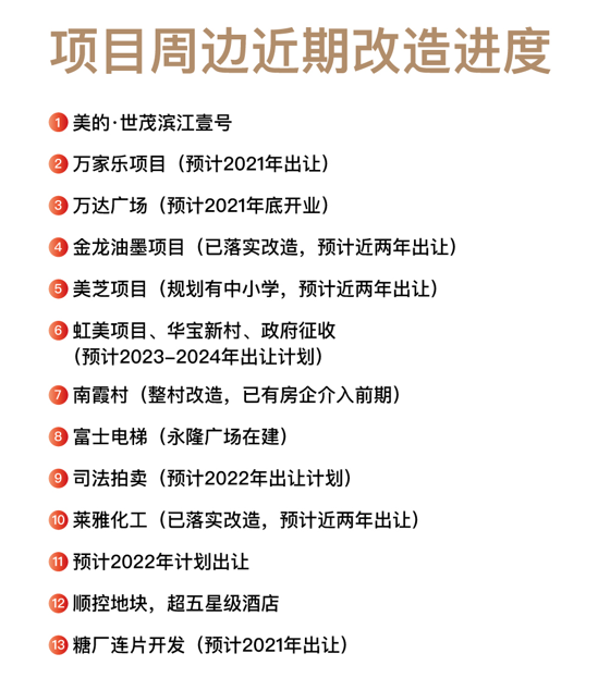 据悉,今年三季度大良万家乐地块将拍卖,在大良近1年无供地的空窗期,万家乐地块将是今年的“兵家必争”之地!更何况,毗邻的万达广场将在今年12月开业,万达所在,多是引领城市消费的新方向;德胜河北岸工程也提上日程,糖厂地块开发,预计将于今年出让,规划建设新一代文旅产业标杆,又一重红利加持。