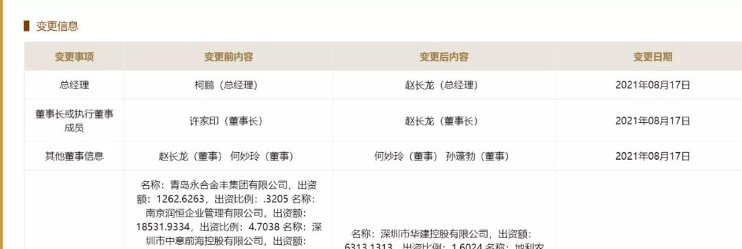 8月17日,国家企业信用信息公示系统(广东)显示,恒大地产集团更换董事长、总经理以及法人代表。许家印不再担任恒大地产董事长,柯鹏卸任总经理、法人代表等职位,新任董事长、总经理和法人代表均为赵长龙。
