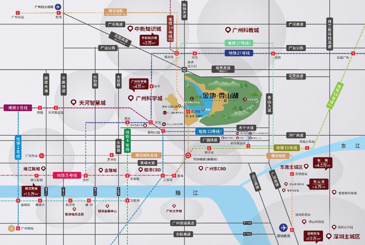 花莞高速通车。金地·香山湖,出门即达花莞高速畅达珠江新城。更可南至珠三角环线高速,直达深圳,东莞。