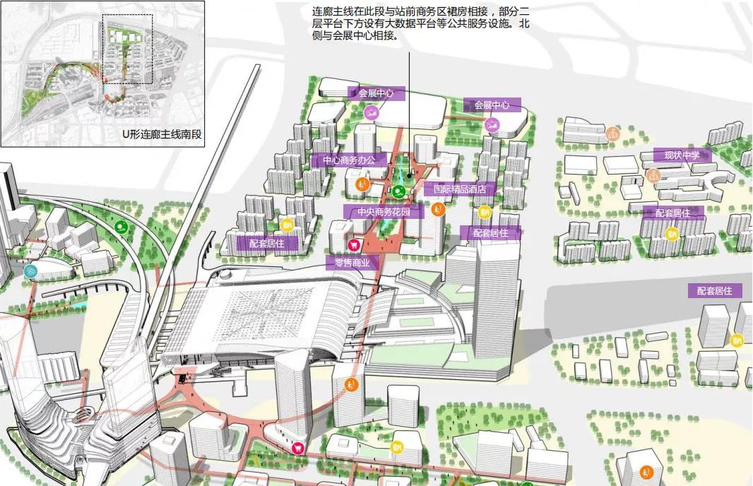 项目周边U型连廊在构建东部枢纽门户形象的同时,形成友好的人行体验。