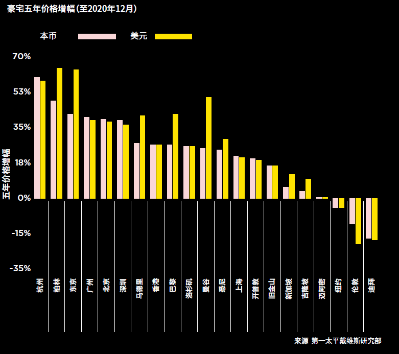 瑞信数据显示,中国总人口四倍于美国,高净值人士的数量则不到美国的四分之一。但在2015年至2019年间,中国高净值人士数量迅速增加,增幅达到277%。这为国内快速发展成熟的豪宅市场提供了强劲增长支撑。过去五年里,北京豪宅价格上涨了39%。而在以技术产业为主导的杭州,豪宅价格同期增幅达到60%,突显新经济领域的财富创造力。