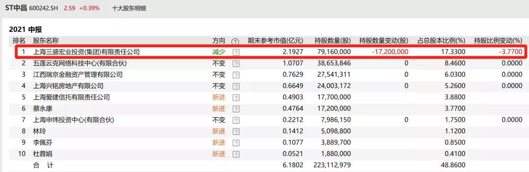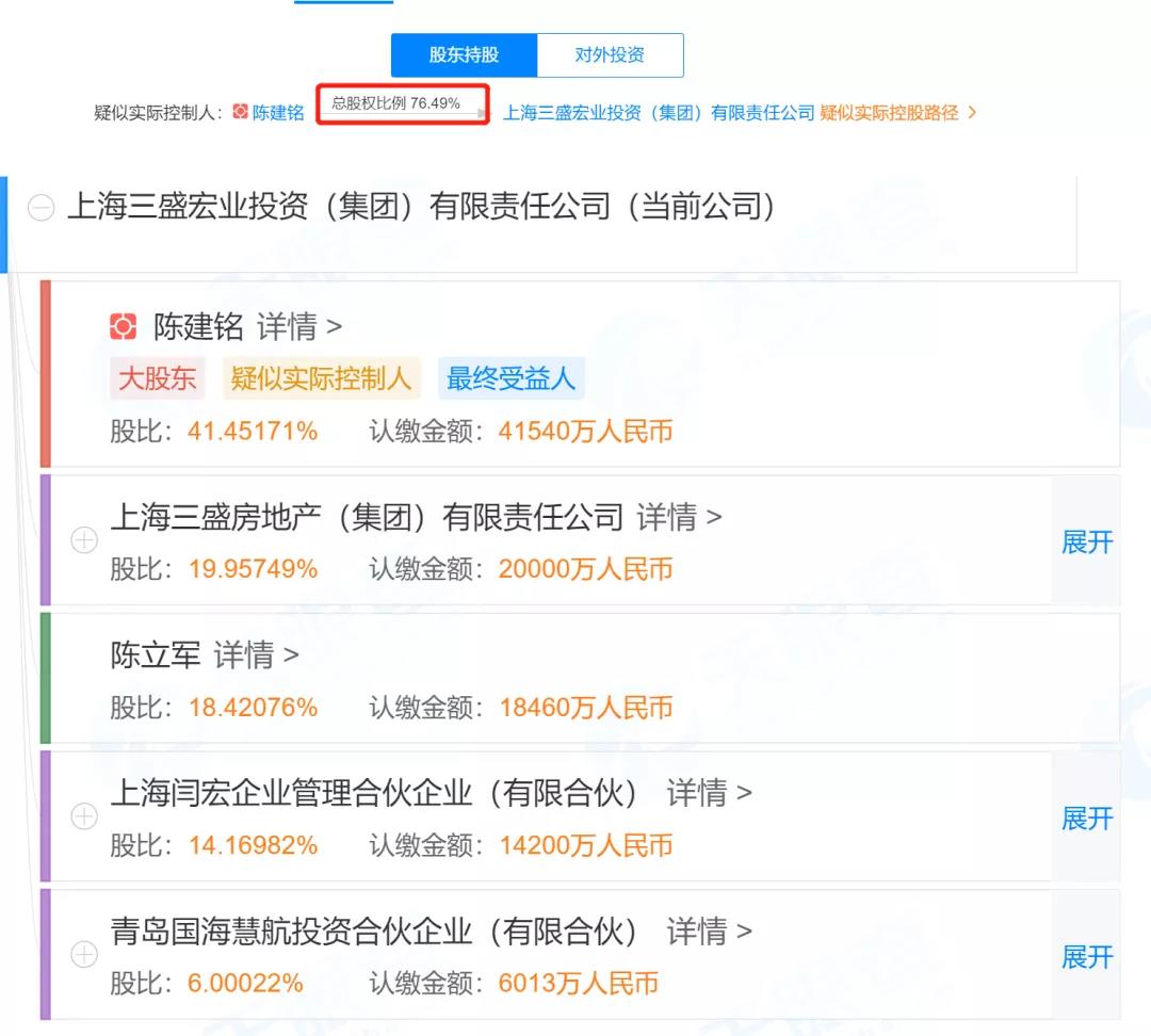 上海三盛创立于1993年,产业主要包括城市开发、金融投资、海运海工、智慧城市等,是中昌大数据股份有限公司(ST中昌,600242.SH)第一大股东,持股17.33%。陈建铭、陈艳红分别为上海三盛的董事长、副董事长,陈建铭持有多家公司股权。