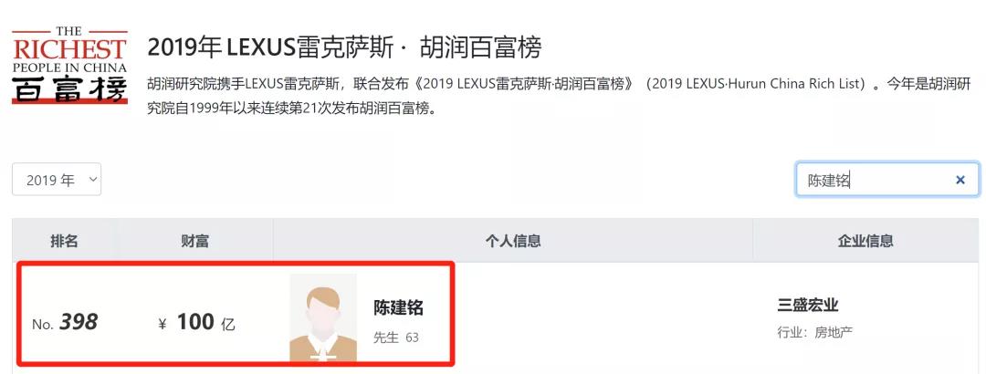 2019年,陈建铭以100亿元位列《2019年胡润百富榜》第398位。