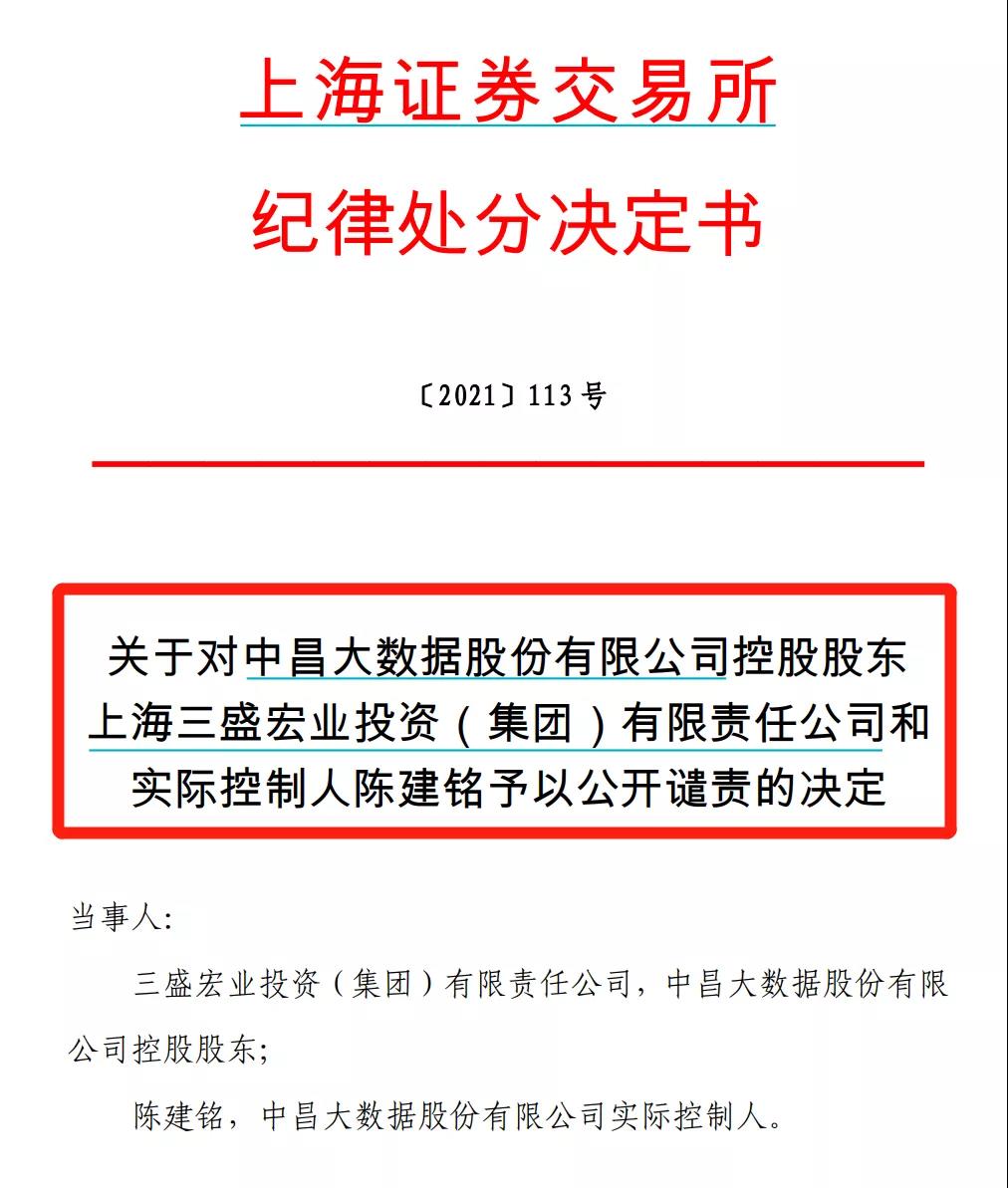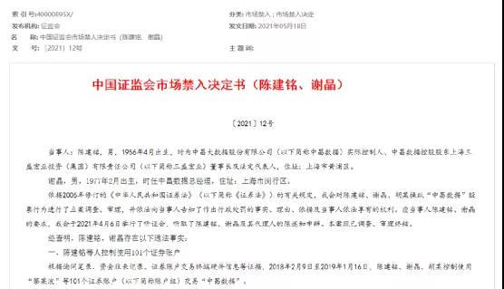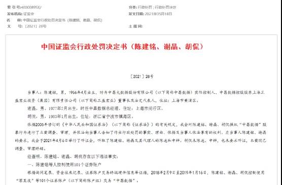 因在2018年2月9日至2019年1月16日期间控制使用101个证券账户交易自己公司股票,证监会对时任中昌数据实际控制人陈建铭、时任中昌数据总经理谢晶及胡侃没收违法所得1147.23万元,并处以2294.45万元罚款;对陈建铭采取10年证券市场禁入措施,对谢晶采取5年证券市场禁入措施。