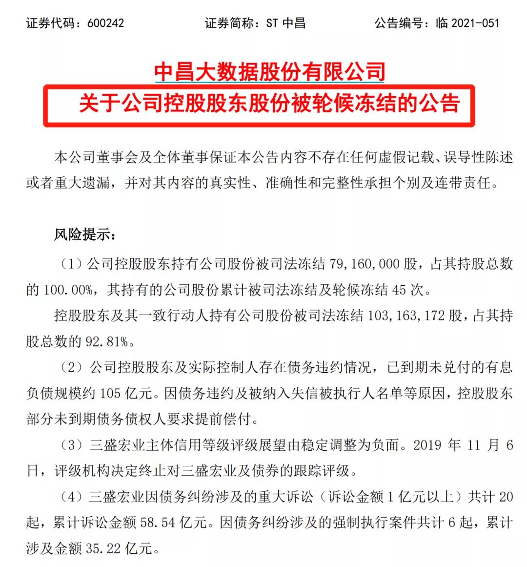 如今,据ST中昌9月2日公告,陈建铭执掌的三盛宏业股份已被司法轮候冻结。