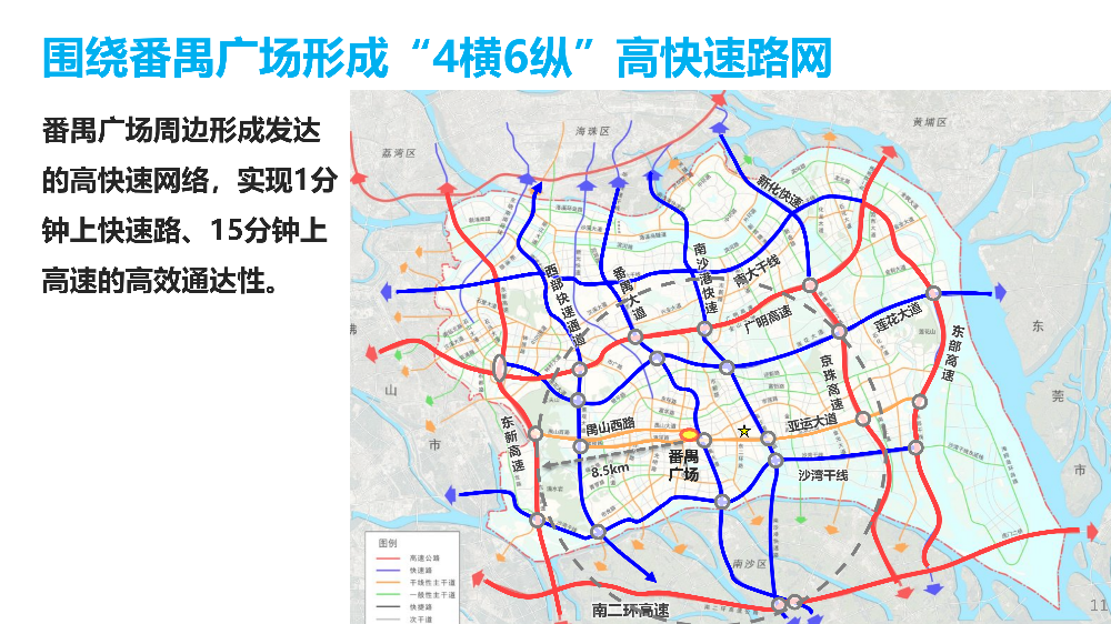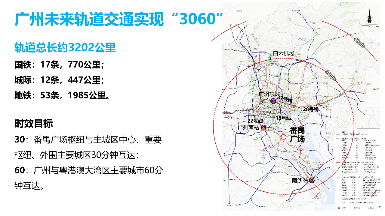 区别于广州火车站、白云棠溪站以及新塘站等侧重于城市间互融互通的交通枢纽,番禺广场TOD着重加强城市内部发展建设紧密联系,通过提供交通出行、商业办公、休闲娱乐等全方位功能服务,成为广州南部不二的公共服务中心。“番禺广场TOD,是真正意义上为城市生活服务的轨道枢纽”,广州市城市规划勘测设计研究院交通规划设计所所长张晓明分析道,番禺广场TOD的战略意义有两层含义。张晓明 广州市城市规划勘测设计研究院交通规划设计所所长第一,它将番禺广场及番禺地区真正融入珠三角的城际轨道网当中。除三号线外,番禺规划在建的18号线、22号线,均具有长距离通达的城际功能,可以快速串联广州各大交通枢纽并与珠三角地区实现无缝换乘,是打通广州南北大动脉的重要一环。第二,番禺广场TOD以居住、商务办公、商业、文化休闲和交通为主导功能,是番禺第一个综合轨道枢纽的TOD发展片区,与城市生活密切相关,是真正意义上的城市级轨道交通TOD地区。番禺广场TOD将番禺地区真正融入珠三角的城际轨道网当中待番禺广场TOD枢纽建成之后,可通过22号线约15分钟直达广州南站,约半个小时直接进入广州中心区以及南沙地区,约45分钟可畅达广州白云机场,约一个小时可以与湾区主要城市中心实现快速接驳,这座枢纽“任意门”的开启,对于番禺地区来说是融入湾区核心的绝佳机会!未来,通过番禺广场TOD枢纽的多维交通,实现广州中心区、番禺、南沙、白云机场和广州南站的快速串联后,将为番禺地区的发展注入无限可能,成为激活区域的“财富密码”!随着粤港澳大湾区大发展大建设大升级的背景不断深化,广州南拓进程进一步提速以顺应高速发展趋势。位处湾区几何中心的番禺正全力打造世界级的枢纽门户,建设宜居宜业的优质生活圈,番禺广场TOD片区自然成为了湾区城市高质量发展的典范。张晓明指出,番禺广场TOD片区处于广州城市空间发展战略南进轴线上的重要节点,东临广深科技走廊,西靠广州南站,正是主城向南连接南沙的“腰部”位置,可以说是带动区域实现整体发力的重要部位。“腰部”的核心力量源自于“四轨交汇”的广州中轴南部轨道枢纽,围绕番禺广场还形成“4横6纵”的交通网络格局,具有1分钟上快速路、15分钟上高速的高通达性。未来的番禺广场TOD将打造为区公共服务中心及轨道交通枢纽,以交通核组织人行流线便捷换乘,形成集轨道、公交、有轨电车等交通设施一体的交通枢纽,实现人流、物流无障碍通达。一系列轨交红利都在加码湾区枢纽的建设,进一步激活区域发展动力。