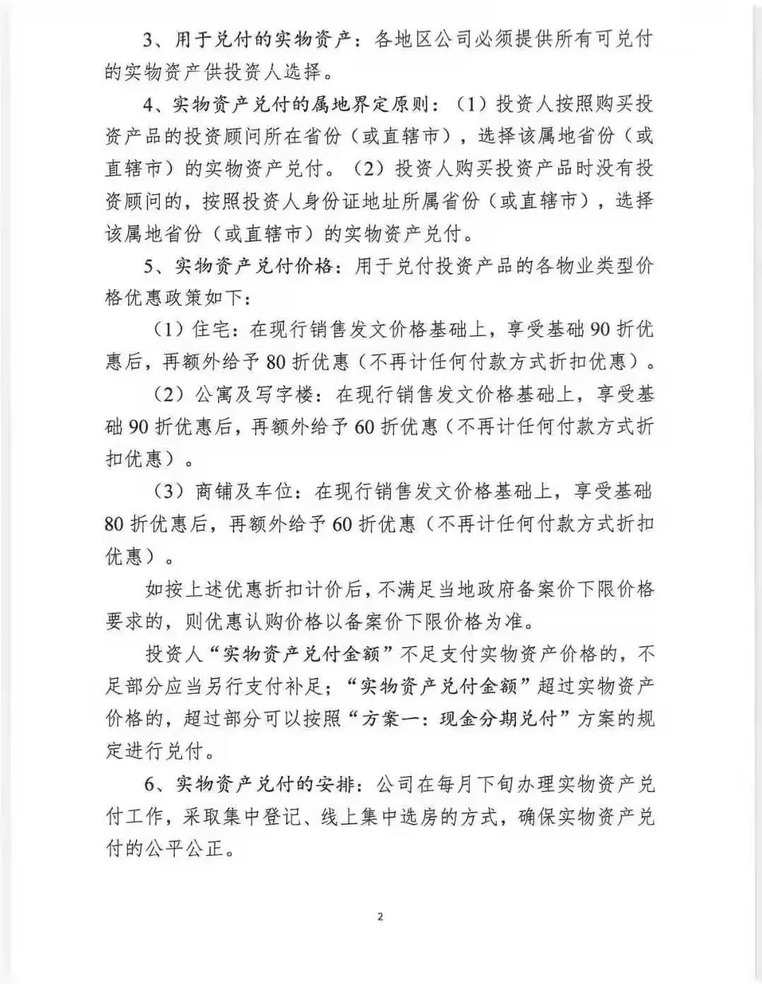 方案二为实物资产兑付。实物资产的兑付范围包括:合同约定期限到期的投资产品,以及虽然合同约定期限未到期但投资人要求提前以实物资产兑付的投资产品。实物资产兑付金额为:合同的定期限到期的投资产品,实物资产支付金额为投资产品本金和截至产品到期日合同约定的利息,产品到期日之后不再计息;合同约定期限未到期的投资产品,实物资产兑付金额为投资产品本金和截至投资人要求提前以实物资产兑付之日的利息,投资人要求提前兑付之后,不再计息;投资人在产品到期日之前可以在每月下旬随时要求提前以实物资产兑付。