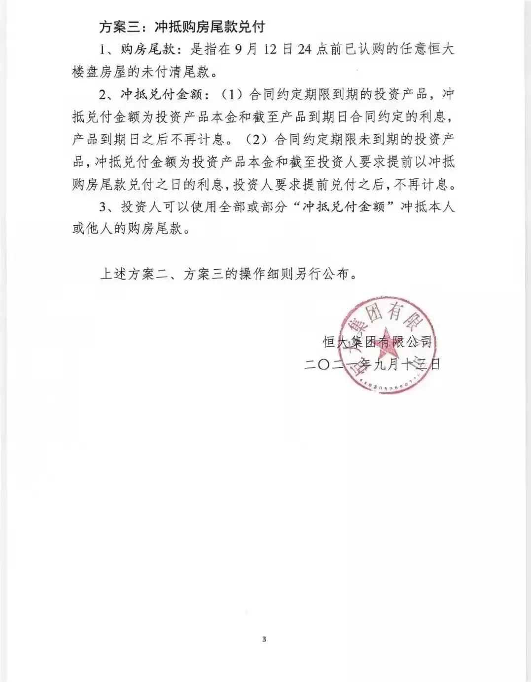 方案三为冲抵购房尾款兑付。方案显示,购房尾款是指在9月12日24时前已认购的任意恒大楼盘房屋的未付清尾款。