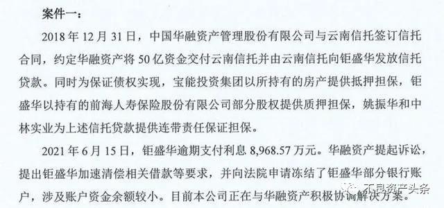 2018年12月31日,中国华融资产管理股份有限公司与云南国际信托有限公司签订信托合同,约定华融资产将50亿资金交付云南信托并由云南信托向钜盛华发放信托贷款。