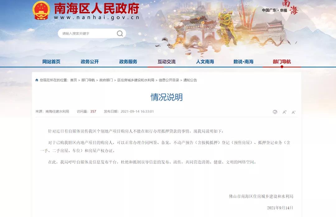 9月14日,南海区住房城乡建设和水利局针对近日自媒体误传个别地产项目购房人不能在银行办理抵押贷款的情况,发布了说明。内容如下: