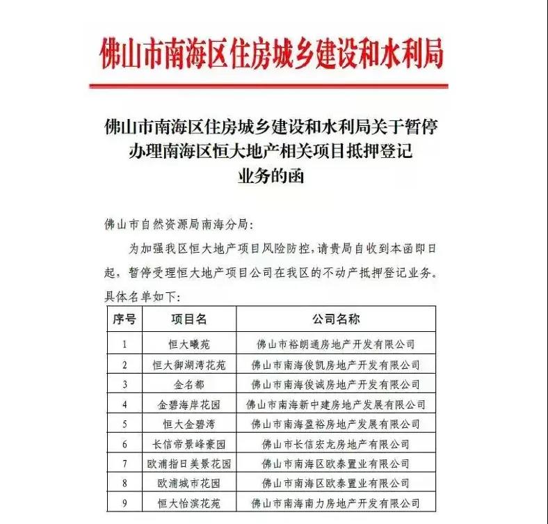 昨日,传佛山市南海区住建局向自然资源局南海分局致函:为加强南海区恒大地产项目风控,请收到本函即日起,暂停受理恒大地产项目公司在南海区的不动产抵押登记业务。